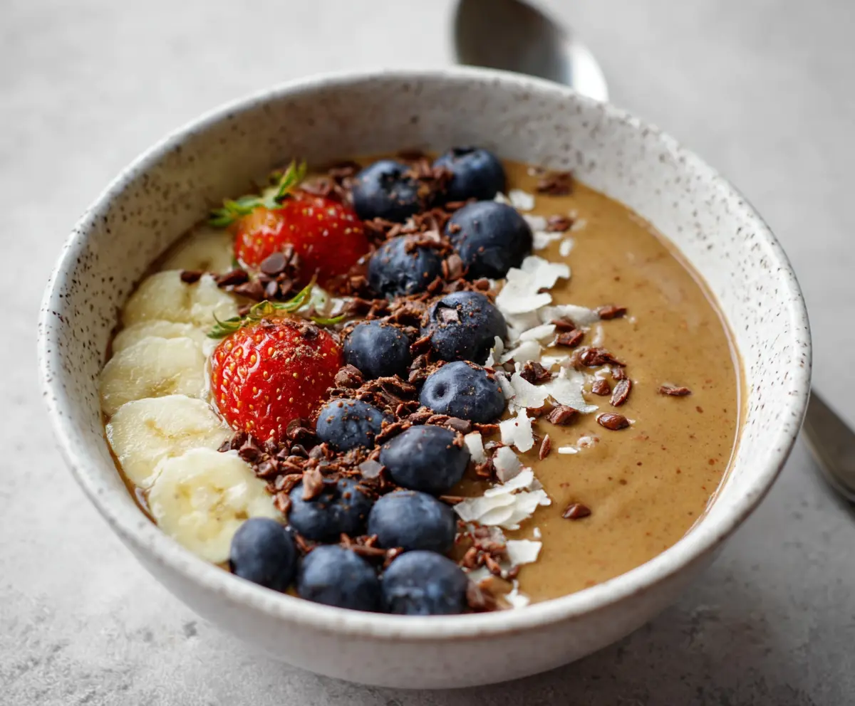 Healthy protein smoothie bowl topped with fresh fruits and nuts for a nutritious breakfast