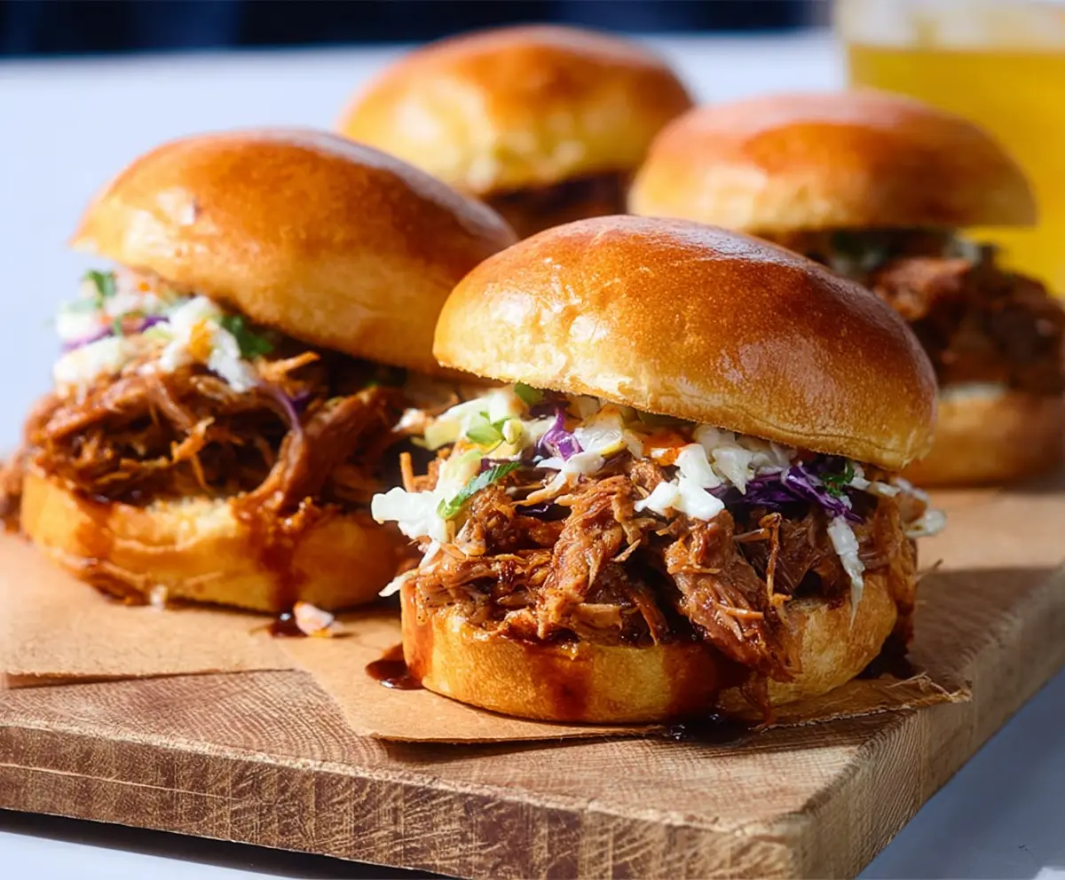 Delicious pulled pork sandwiches with fluffy buns and tangy barbecue sauce on a wooden platter.
