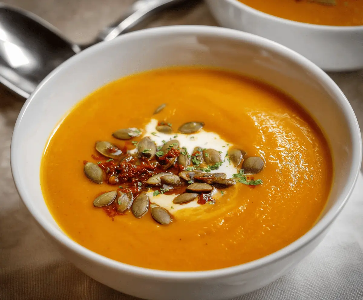 Creamy pumpkin soup served in a bowl garnished with fresh herbs, perfect for fall comfort food