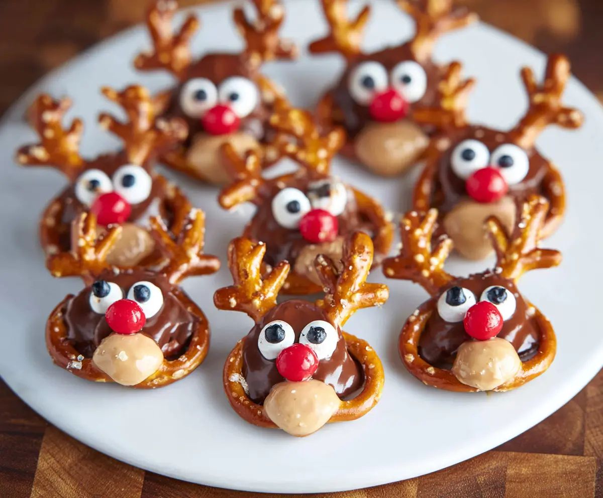 These Reindeer Pretzel Bites are adorable snacks that mix sweet and salty. They use pretzels, chocolate, and candy eyes to create cute little reindeers!