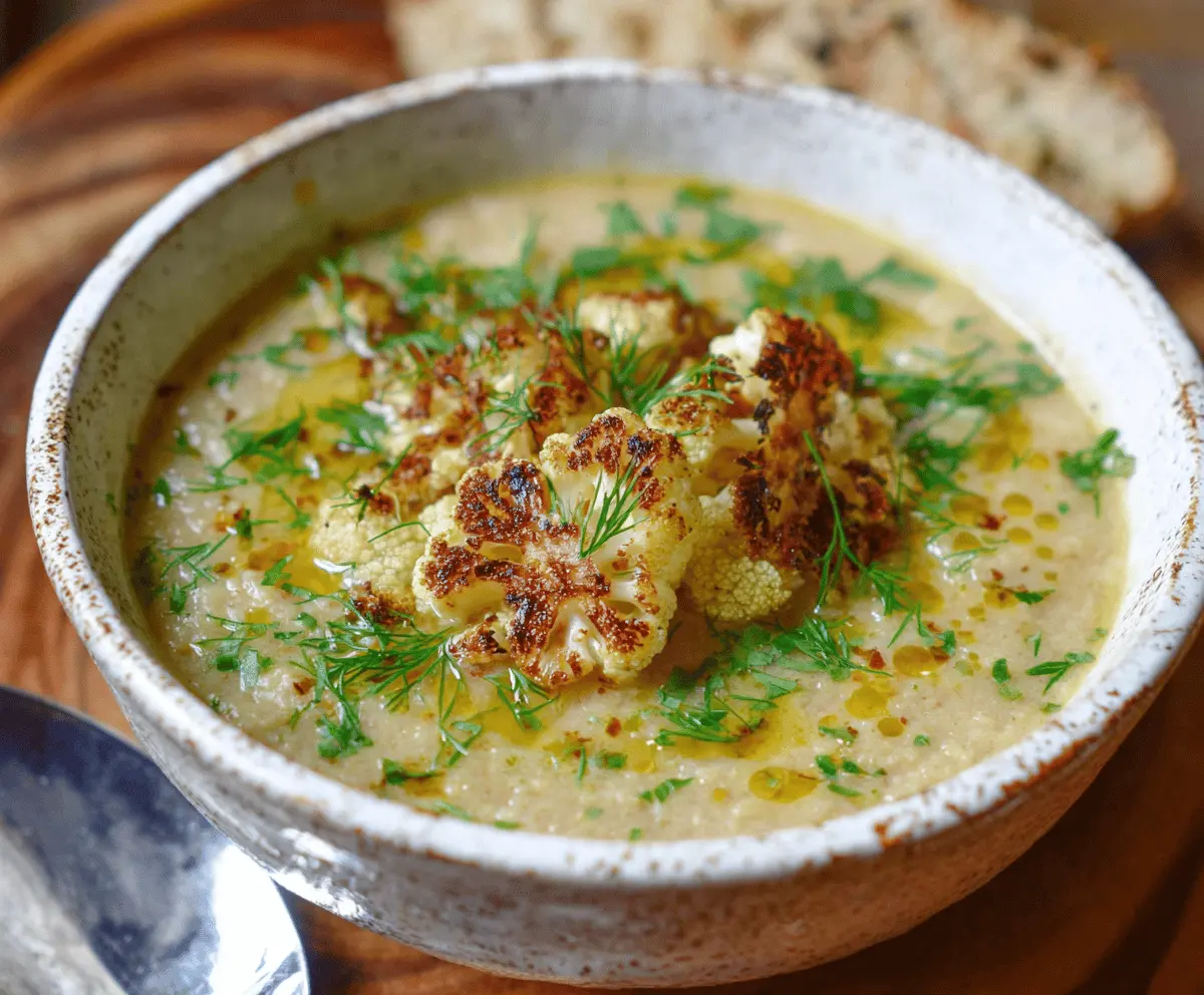 Ladle the soup into bowls. For a lovely finish, add a roasted cauliflower floret in each bowl as a garnish, sprinkle with fresh dill and some toasted almond flakes or nuts if you like. Serve hot with crusty bread or your favorite side for a cozy meal!