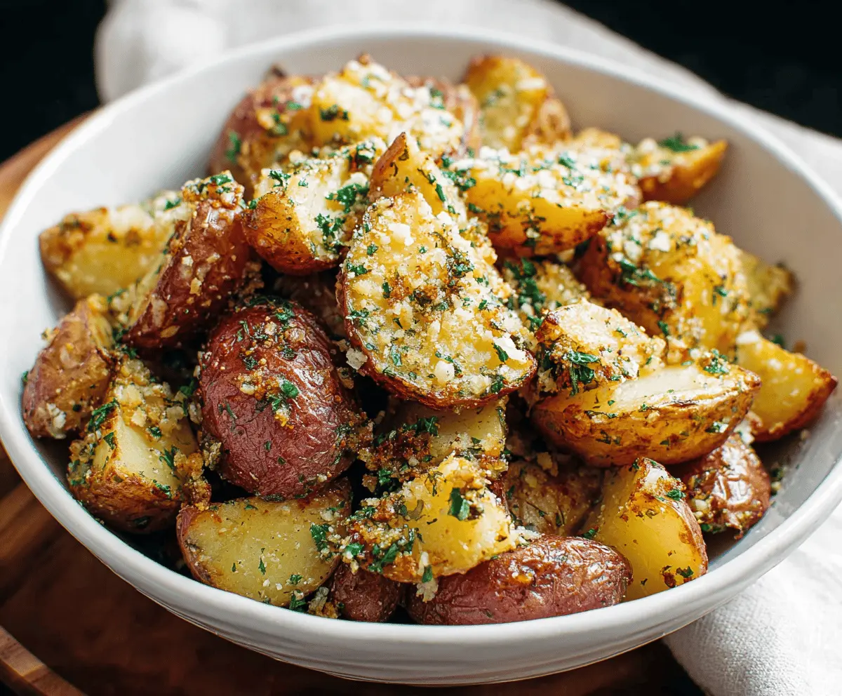 Golden roasted garlic Parmesan potatoes served on a plate, topped with fresh herbs.