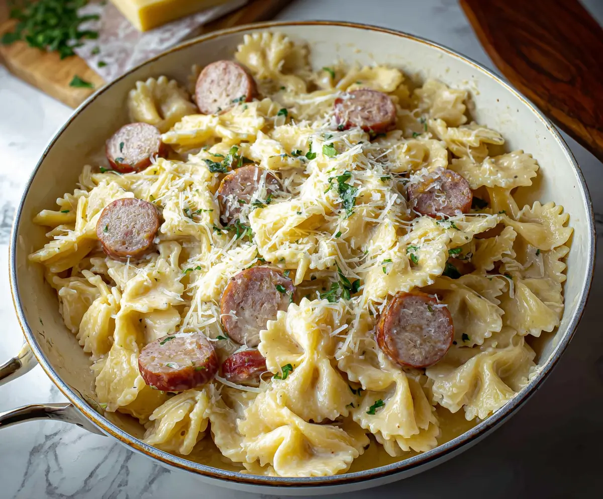 Return the cooked sausage to the skillet. Then, add the drained pasta and toss everything together until the pasta is evenly coated in the rich Alfredo sauce. Remove from heat and garnish with chopped fresh basil or parsley for a pop of color and freshness.