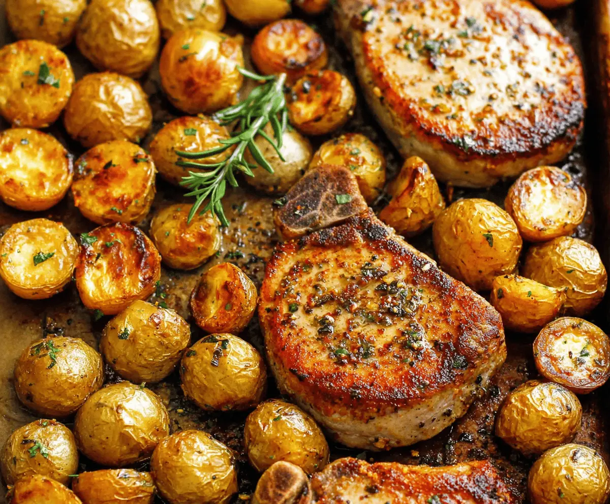 Once everything is cooked, you can add some fresh thyme sprigs and chopped parsley on top for a pop of color. Serve the pork chops and potatoes hot, and enjoy this delicious meal with minimal cleanup!