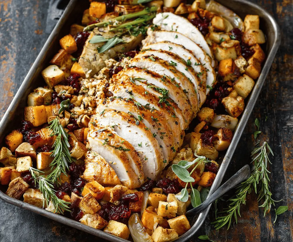 This one-pan meal brings everything together beautifully—a perfect combination of roasted turkey, veggies, and a tangy side of cranberry sauce, simple and satisfying! 🌟