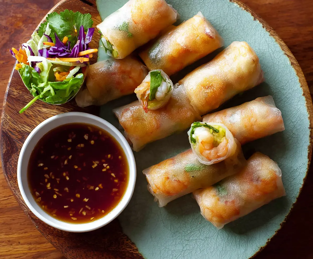 Enjoy your delicious and crispy shrimp pork spring rolls, bursting with fresh flavors and served with a tangy dipping sauce. They’re perfect for sharing with friends and family!