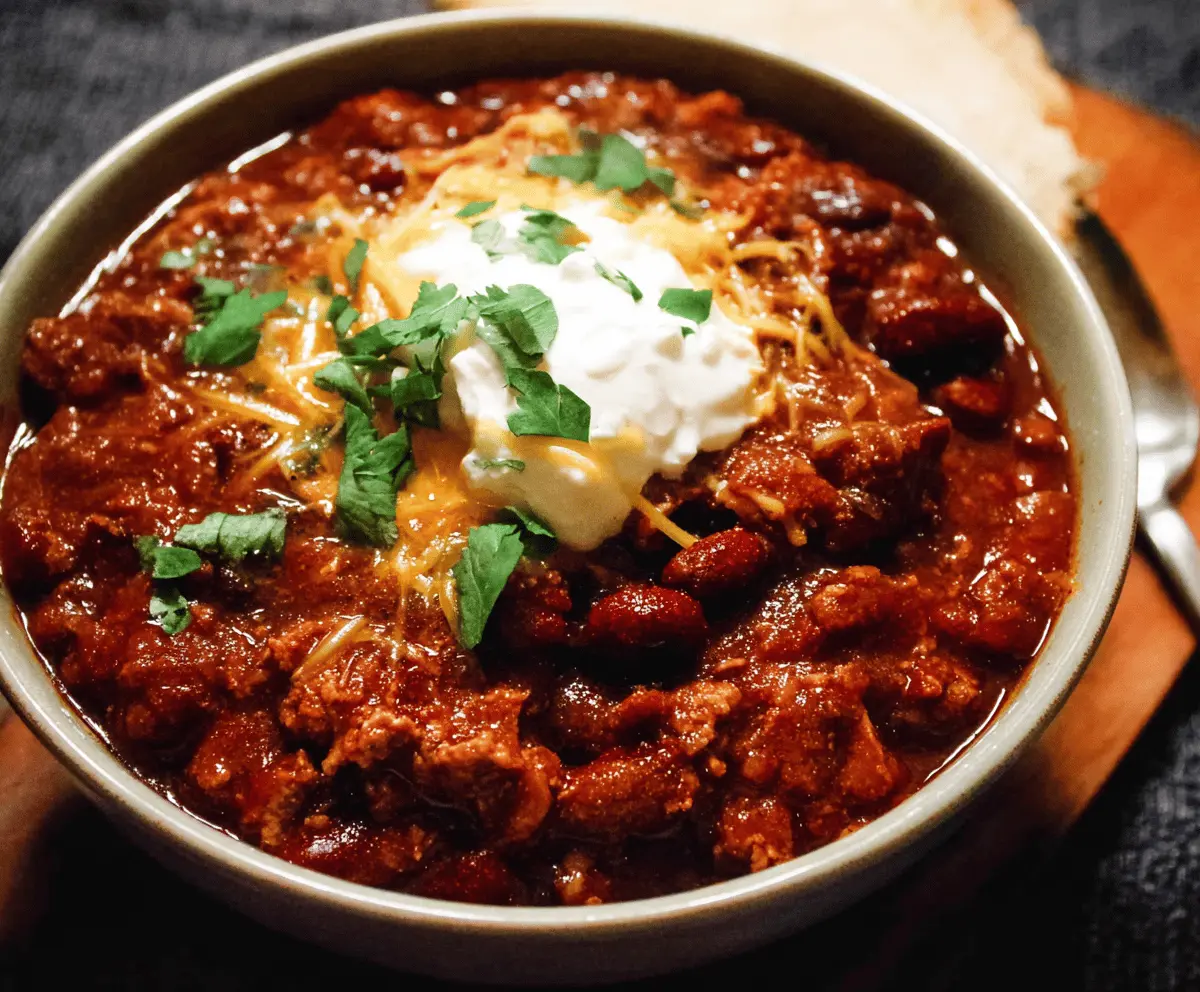Serve your warm chili hot, topped with shredded cheddar cheese, a dollop of sour cream, and sprinkle with chopped green onions and fresh cilantro. Enjoy your hearty, satisfying meal!