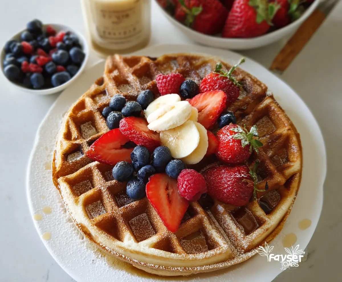 Carefully remove the waffle and place it on a serving plate. Top with your favorite fresh fruit, sprinkle with powdered sugar, and serve immediately with a drizzle of maple syrup or honey. If you like, add a dollop of yogurt or whipped cream for an extra treat!