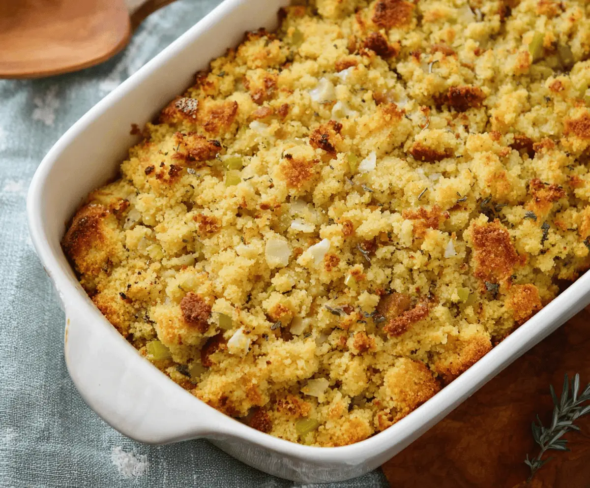 This dressing is a classic Southern favorite, pairing perfectly with roast turkey or chicken. The combination of cornbread with herbed vegetables and savory spices will delight everyone at the table!