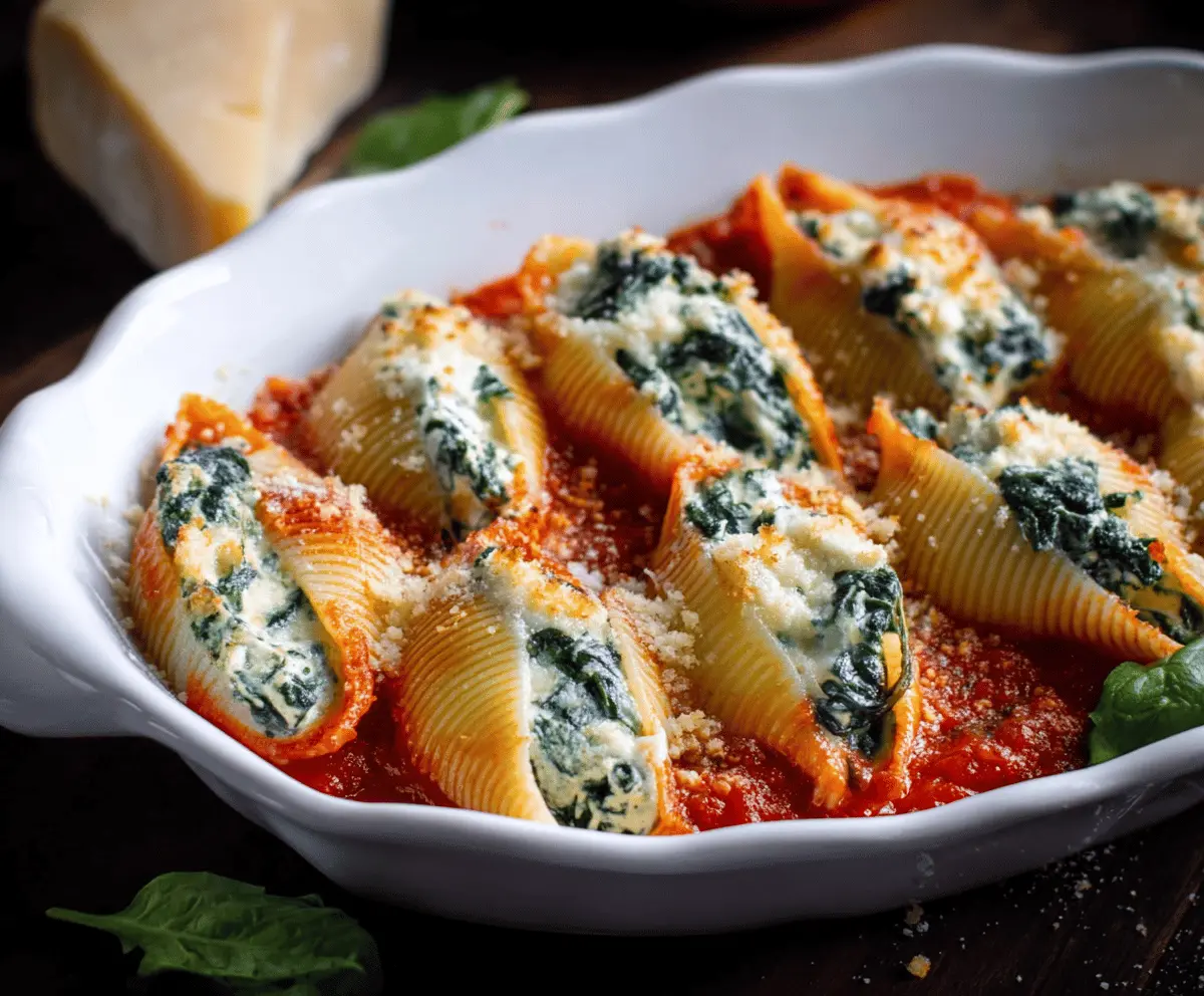 These spinach and ricotta stuffed shells are a flavorful treat! Large pasta shells are filled with a creamy mixture of ricotta cheese and fresh spinach, then topped with marinara sauce and melted cheese.