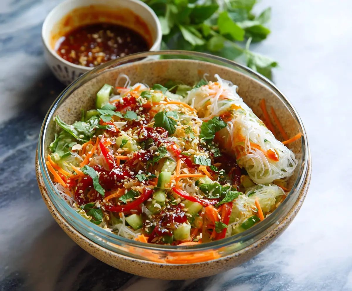 This Spring Roll Salad is a colorful mix of fresh veggies, like crunchy carrots and crisp lettuce, all rolled up in a light and tasty way. The spicy ginger dressing adds a zing that makes every bite exciting!