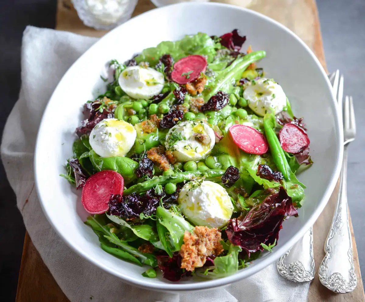 This fresh spring salad is bursting with colors and flavors! It features crisp greens paired with creamy goat cheese and tangy dressings that make every bite a delight.