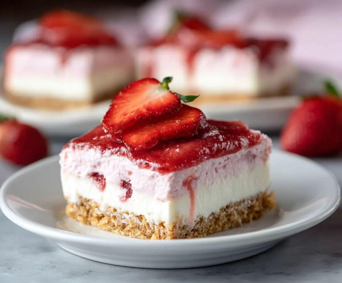 Carefully cut the bars into squares. Serve them chilled, and enjoy your delicious Strawberry Cheesecake Bars with friends and family!