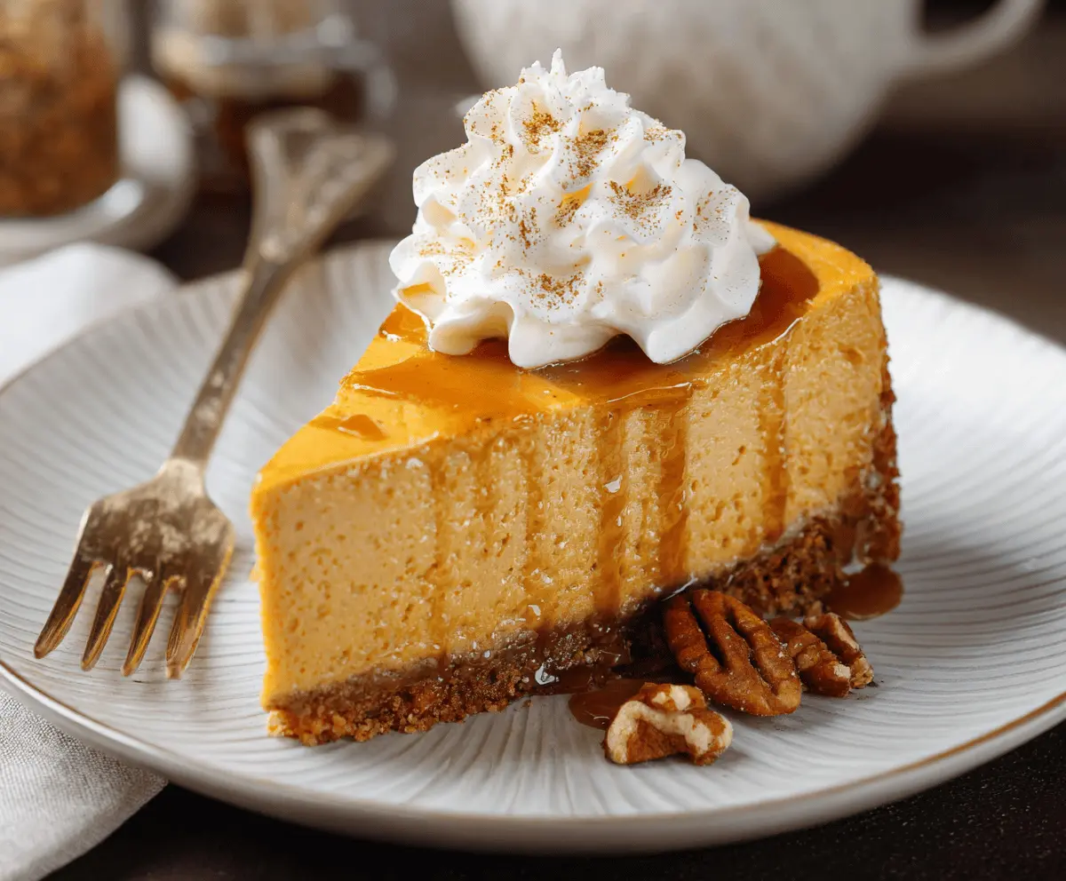 Creamy sweet potato cheesecake topped with whipped cream and caramel drizzle, served on a decorative plate
