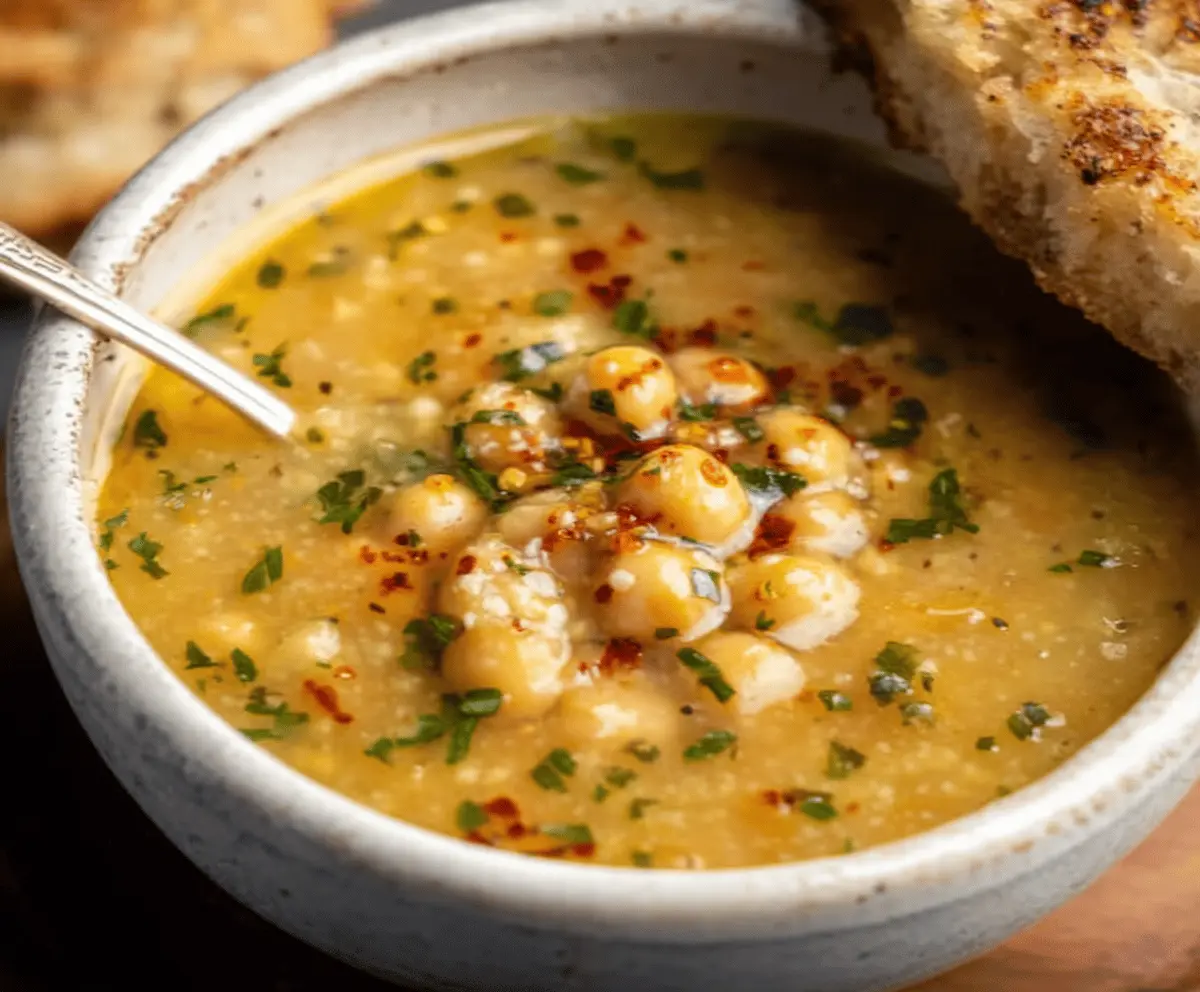 This Vegan Garlic Chickpea Soup is a warm hug in a bowl! Packed with chickpeas, garlic, and spices, it’s cozy and hearty without any dairy.