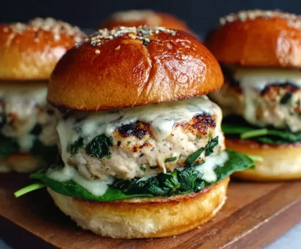 This recipe yields mouthwatering chicken burgers enriched with fresh spinach and creamy white cheddar, perfectly nestled in a soft brioche bun. Happy cooking!